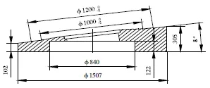 三偏心金屬硬密封蝶閥的密封面是斜錐面,閥體密封圈(圖1)與蝶板組合件密封圈(圖2)的接觸為面接觸,其工作原理是靠驅(qū)動(dòng)裝置扭力直接帶動(dòng)蝶板組合件,使蝶板組合件密封圈與閥體密封圈充分接觸后產(chǎn)生彈性變形而密封。三偏心金屬硬密封蝶閥作為一種高性能閥門,具有耐腐蝕性好、密封可靠、開(kāi)啟力矩小等優(yōu)點(diǎn)。三偏心硬密封電動(dòng)蝶閥DN1200,其中閥體密封圈材料為1Cr18Ni9Ti,蝶板組合件密封圈材料為復(fù)合的不銹鋼板與石棉板夾層組合件,閥體密封圈與蝶板組合件密封圈的加工質(zhì)量直接決定蝶閥密封性能。