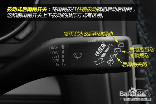 后雨刮的開關(guān)也設(shè)置在雨刮撥桿上,與前雨刮機(jī)構(gòu)是兩個獨(dú)立的系統(tǒng),可以單獨(dú)控制。后雨刮開關(guān)有兩種樣式,分別為撥動式和旋鈕式。