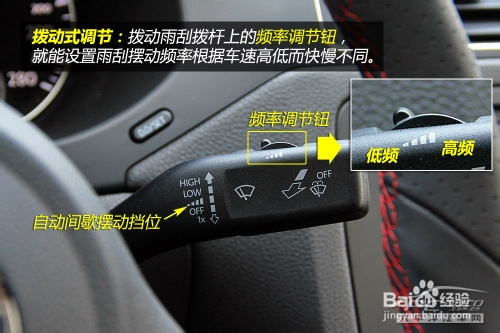 某些車型雨刮的自動間歇工作擋位是可以調(diào)節(jié)擺動頻率的,讓雨刮擺動頻率根據(jù)車速高低而快慢不同——將雨刮撥桿置于“自動間歇擺動”擋位時,雨刮便會依照調(diào)節(jié)的頻率,根據(jù)車速快慢來變化擺動頻率。擺動頻率的調(diào)節(jié)機(jī)構(gòu)主要有兩種樣式:撥動式及旋鈕式。